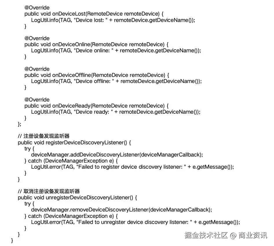 在上述代码中,我们首先获取了DeviceManager实例,然后通过它获取本地设备的信息,包括设备名称和NetworkId。接着,我们注册了设备发现监听器,当有新设备上线或设备状态发生变化时,会收到相应的回调通知。在实际应用中,我们可以根据设备发现的结果,选择目标设备并建立通信连接,实现数据的传输与同步。