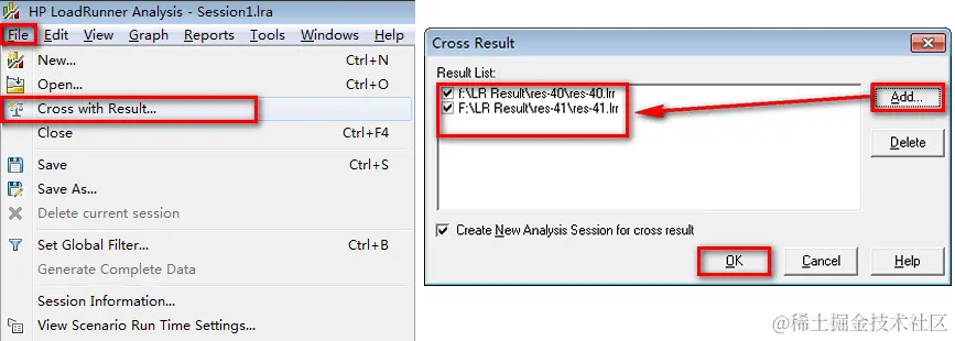 1. 在Analysis工具点击File菜单 -> Cross with Result... 2. 点击Add添加上次结果目录文件 (.lrr)