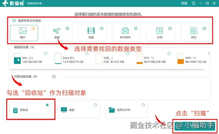 步骤1: 在电脑中选择自己需要恢复的文件类型,再勾选“回收站”作为扫描对象,点击“扫描”按钮后,耐心等待软件完成扫描工作;