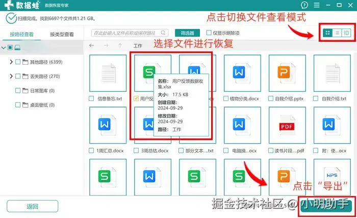 步骤2: 等待软件完成扫描后,在指定的位置上,用户就能选择文件进行恢复(可以根据 显示出来的信息进行判断,查看更多信息可点击右上角的三个格子选择查看模式);选中后点击文件,按下“导出”;