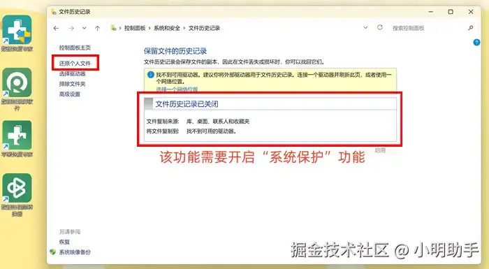 如果您使用的是Windows电脑系统,则可以使用系统里面自带的“文件历史记录”还原回收站清空的文件。回收站清空了怎么恢复文件?下面的操作可以帮助您找到并尝试使用该功能: