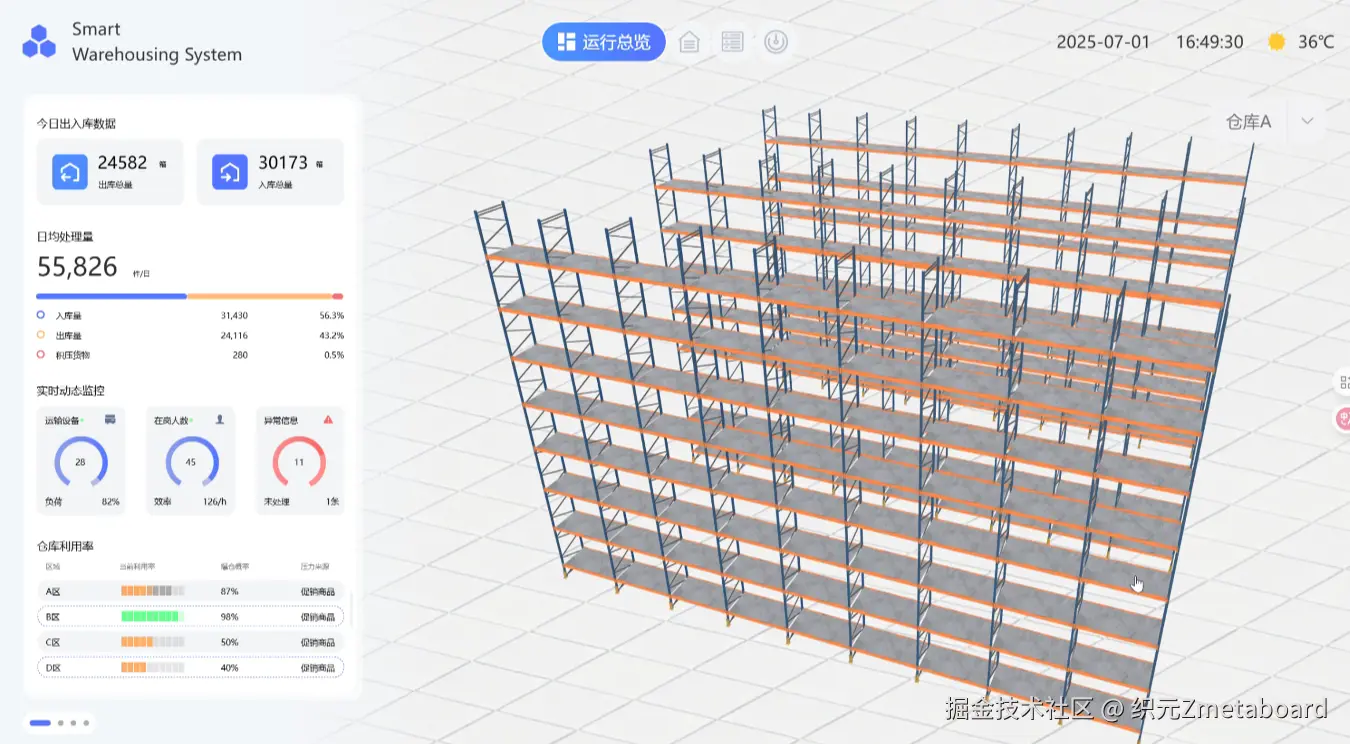 在仓储管理领域,传统的三维仓储可视化建模常常令人望而却步。繁琐的建模流程、专业的技术要求,不仅耗时耗力,还容易影响仓储规划的时效性。如何找到精准且灵活的解决方案?今天介绍一款Zmetaboard中的可变资产模型工具,它改变了仓储可视化搭建的模式。下文将展示这一工具与Zmetaboard产品相结合,利用其中的模板轻松创建一个高效的仓储管理看板。