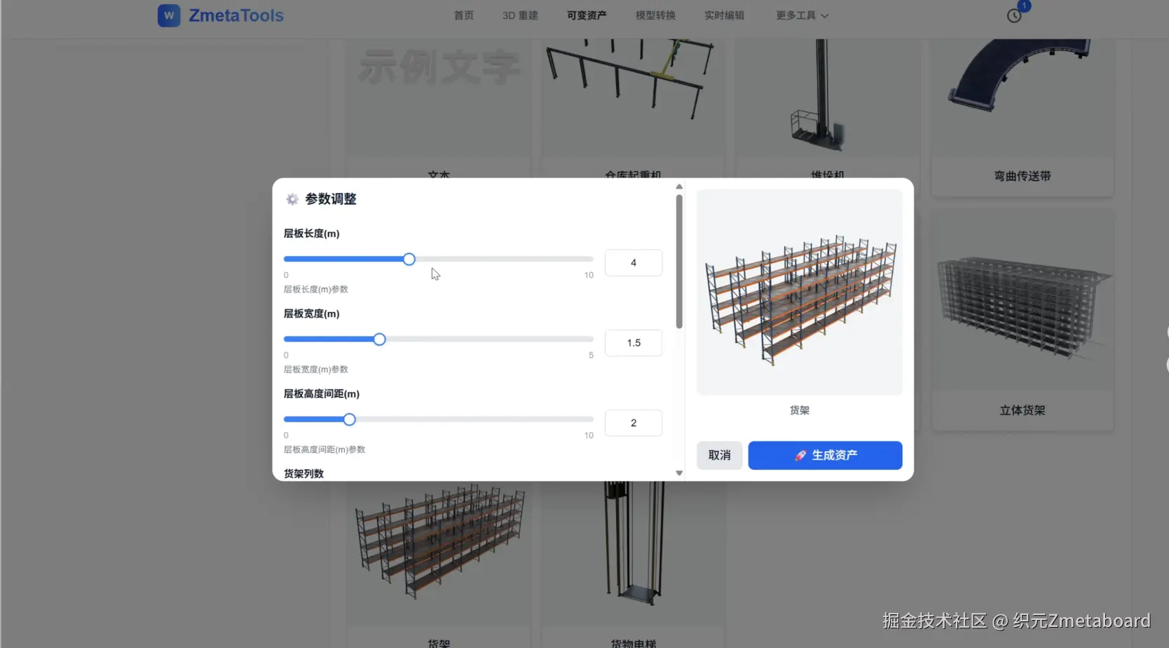 Zmetaboard中的可变资产模型工具,最大的亮点在于,无需任何建模基础,普通用户也能轻松上手。它允许用户根据实际需求,通过简单的拖拽自由调整模型的长、宽、高尺寸,精确设置模型数量及间距等关键变量。无论您面临的是狭小空间的高效利用,还是大规模仓储,这款工具都能提供量身定制的解决方案。
