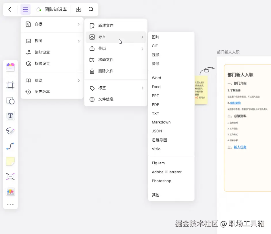 大多数团队在搭建新知识库时,都已经积累了大量的存量文档。boardmix强大的文件兼容性,让知识迁移变得异常轻松。你可以直接将本地的Word、PDF、PPT等文件拖拽到白板上,它们会自动渲染并以内嵌附件的形式呈现,可以直接在白板上滚动查看。