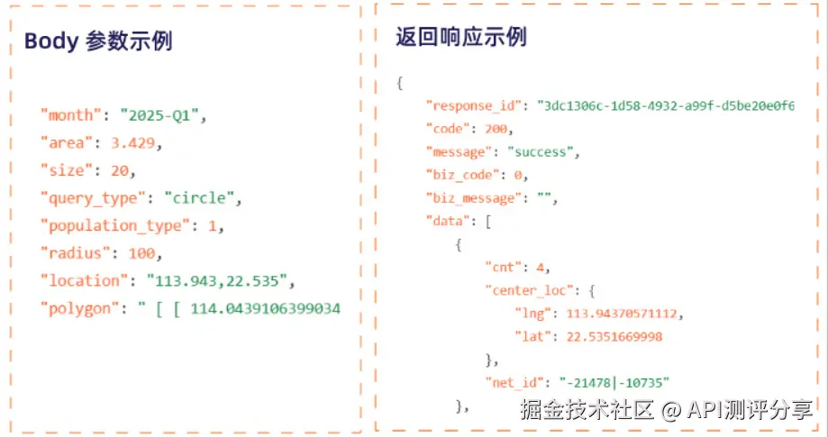 从Body参数中可知,我们可以自由选择想要查询的历史时间周期,可以要求Q1\Q2\Q3\Q4这种时间维度,同时也可以通过circle/polygon的围栏来选定想要查询的区域,地理维度上也十分灵活。