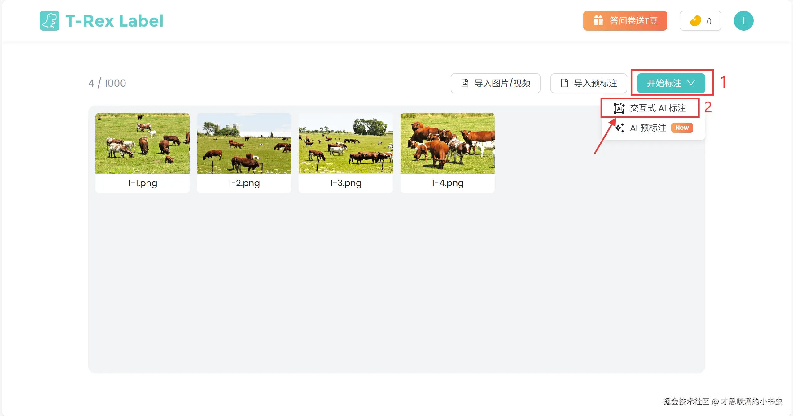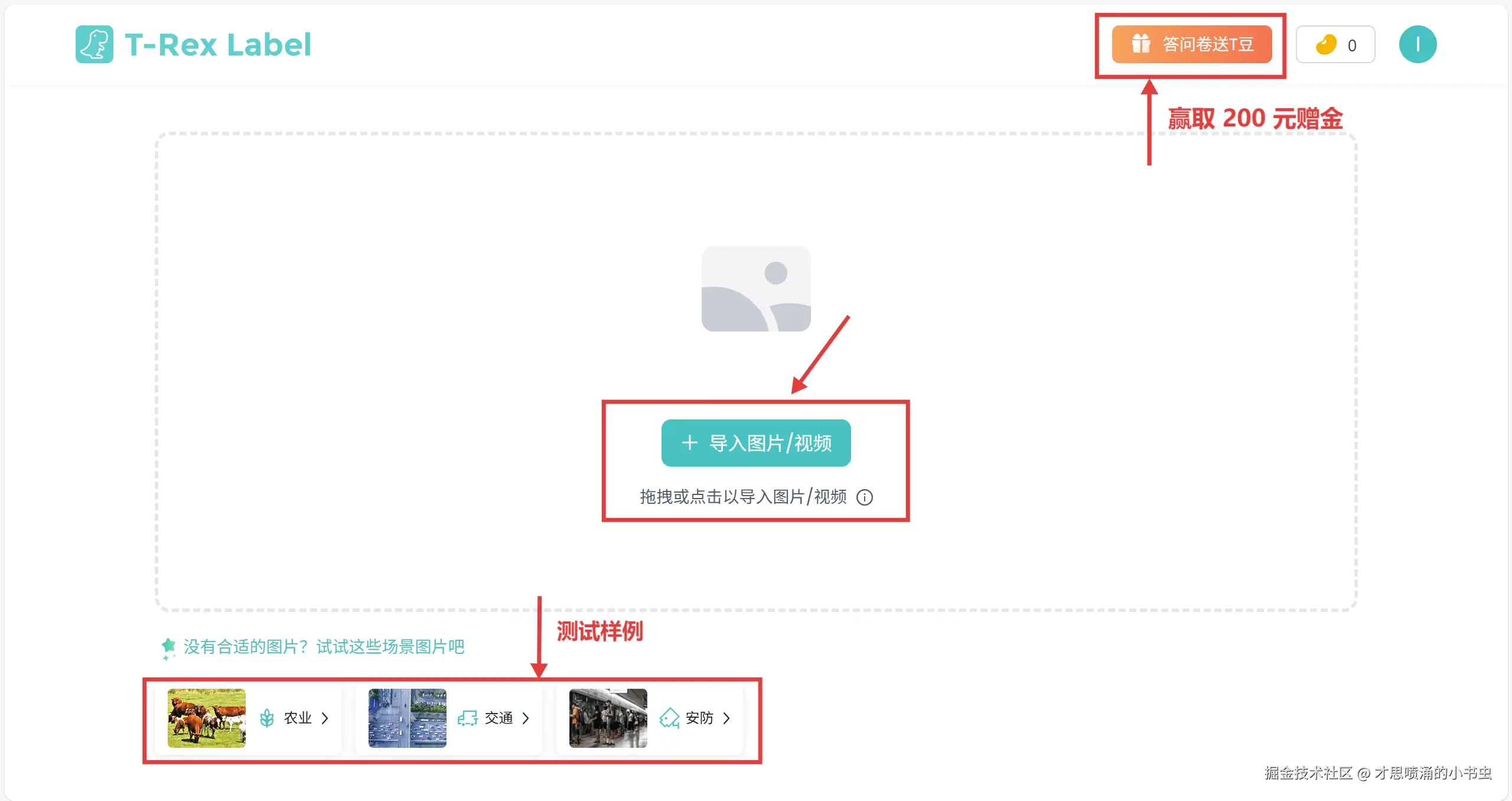 按照文字引导导入要标注的图片或视频。如果你只是想了解平台的标注效果,也可以点击左下方由平台提供的测试样例。值得注意的是,目前 T-Rex Label 正在举行有奖调研活动。点击右上角的问卷活动入口,填写对应的产品体验和改进建议,即可获得最高 200 元的赠金,用于体验平台的高级付费功能。