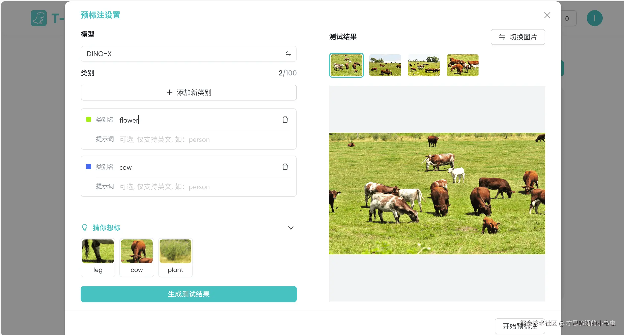 (2)AI 预标注则是基于 DINO-X 视觉模型提供的全量自动标注,用户只需要在第一步设定要标注的类别名称,后续所有工作全部由 AI 进行处理,并输出全量标注结果。
