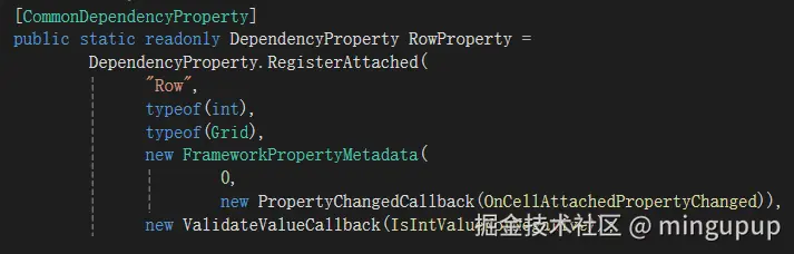注册附加依赖属性使用的是DependencyProperty.RegisterAttached方法。