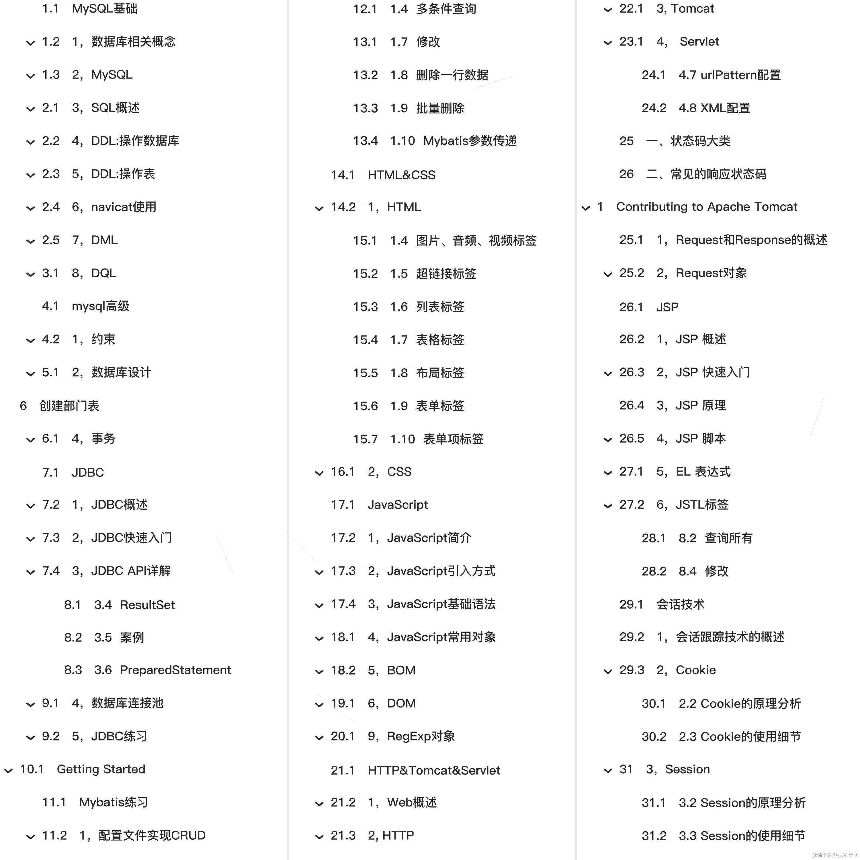 🏆🏆🏆教程全知识点简介:MySQL基础 1,数据库相关概念 2,MySQL 3,SQL概述 4,DDL:操作数据库 6,navicat使用 7,DML mysql高级 1,约束 2,数据库设计 创建部门表 4,事务 JDBC 1,JDBC概述 2,JDBC快速入门 3,JDBC API详解 4,数据库连接池 Getting Started Mybatis练习 1,配置文件实现CRUD HTML&CSS 1,HTML 2,CSS JavaScript 5,BOM 9,RegExp对象 HTTP&Tomcat&Servlet 1,Web概述 2, HTTP 3, Tomcat 4, Servlet 一、状态码大类 二、常见的响应状态码 Contributing to Apache Tomcat Code of Conduct How Can I Contribute? 1,Request和Response的概述 2,Request对象 JSP 3,JSP 原理 5,EL 表达式 6,JSTL标签 会话技术 1,会话跟踪技术的概述 2,Cookie 3,Session 4,用户登录注册案例 Filter&Listener&Ajax 1,Filter 2,Listener 3,Ajax 4,axios 5,JSON 6,案例 VUE&Element 1,VUE 3,综合案例 1,功能介绍 2,环境准备 3,查询所有功能 4,添加功能 6,批量删除 7,分页查询