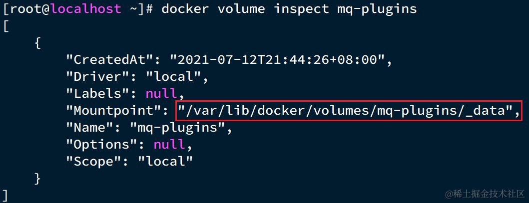 之前设定的RabbitMQ的数据卷名称为mq-plugins,所以 使用下面命令查看数据卷: