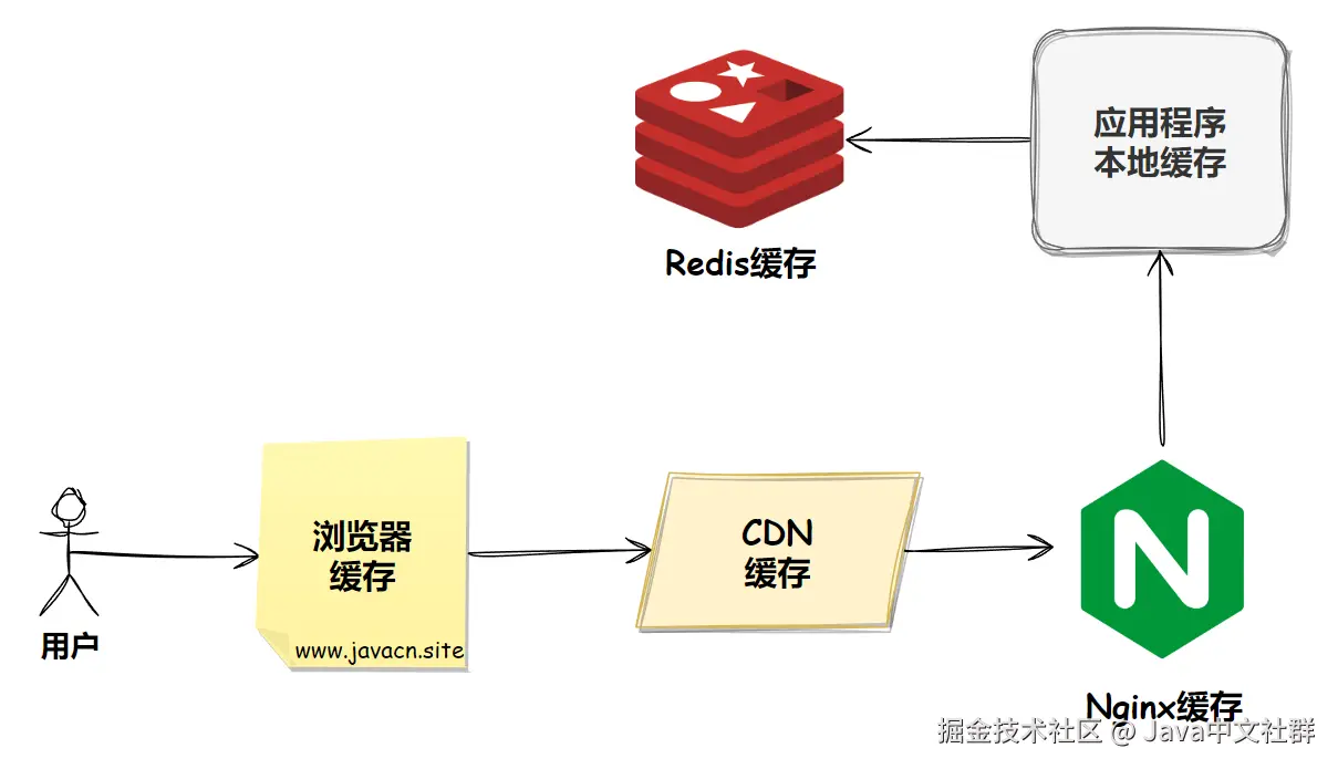 使用多级缓存可以从离用户请求最近的地方优先获取缓存信息,从而保证了更高的查询效率,多级缓存包括以下这些: