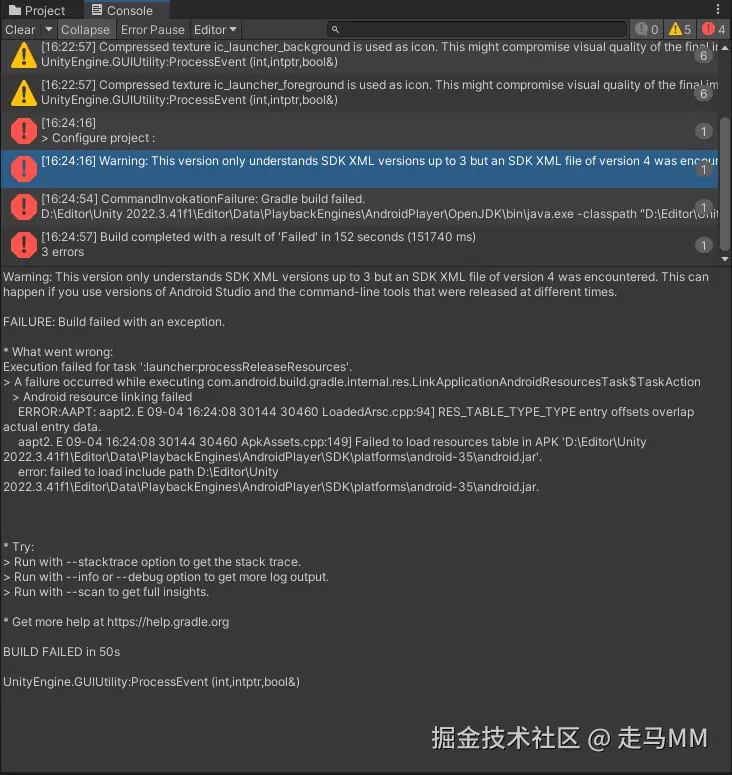 unity的此版本不太兼容api level35,apt连接不上sdk的platforrms和build tool。