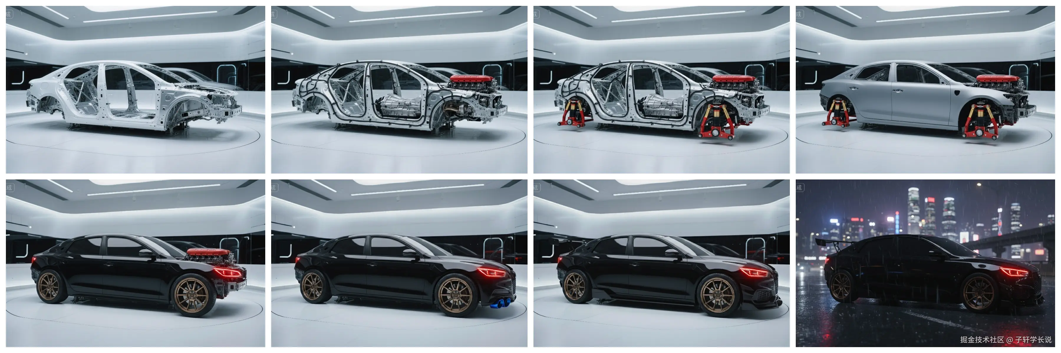 我还做了一辆汽车从车架子到最后炫酷的汽车的组装过程,还有一个手表从零件一步步变成一款腕表的组装过程。