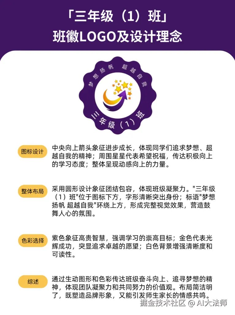 班徽包含元素:星星、箭头、紫色、金色