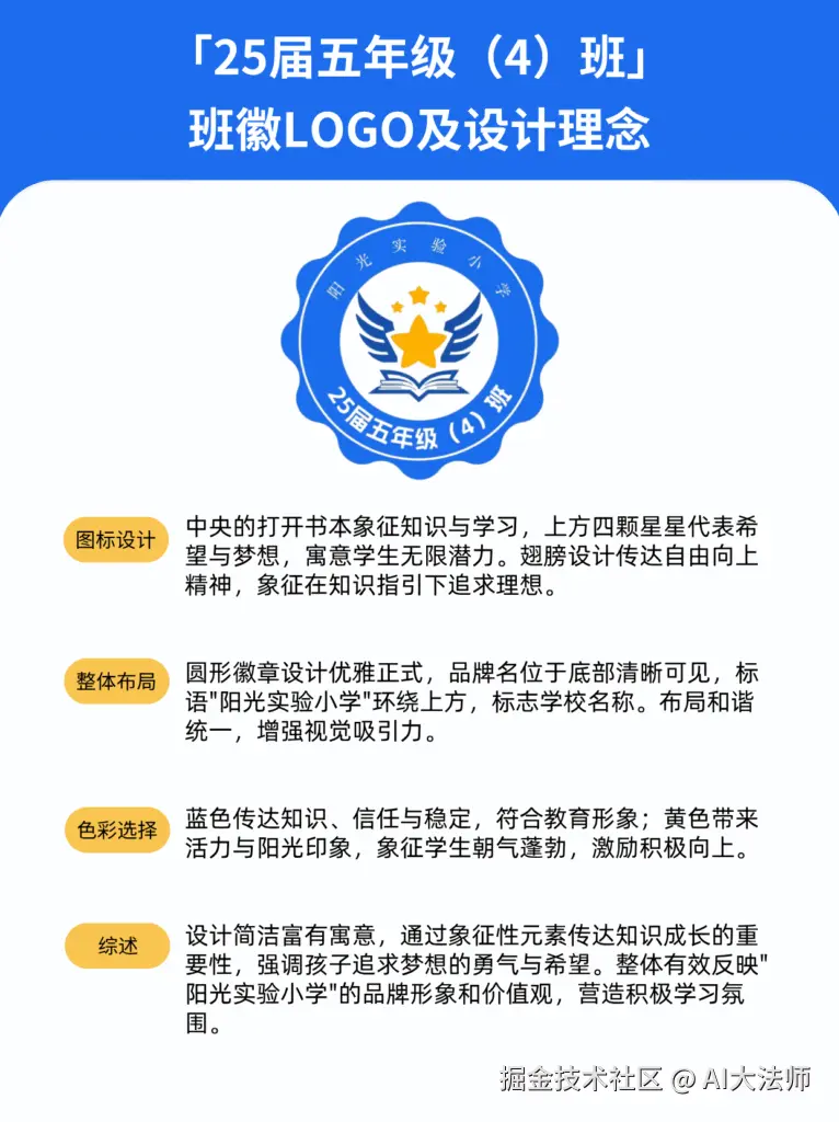 班徽包含元素:书本、翅膀、星星、蓝色