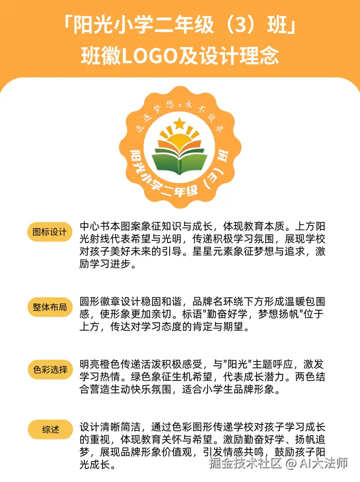2、「阳光小学二年级(3)班」班徽Logo及设计理念