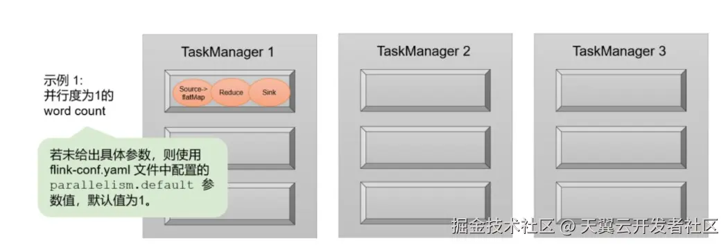 如果我们没有任何并行度设置,而配置文件中默认 parallelism.default=1,那么程序运行的默认并行度为 1,总共有 3 个任务。由于不同算子的任务可以共享任务槽,所以最终占用的 slot只有 1 个。9 个 slot 只用了 1 个,有 8 个空闲,如图 中的 示例1 所示
