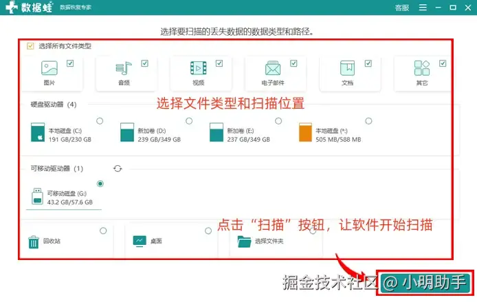 步骤1: 开启软件后进入首页,根据自己的实际需求选择数据类型和扫描位置进行扫描,选好后点击右下角的按钮让软件运行扫描进程;