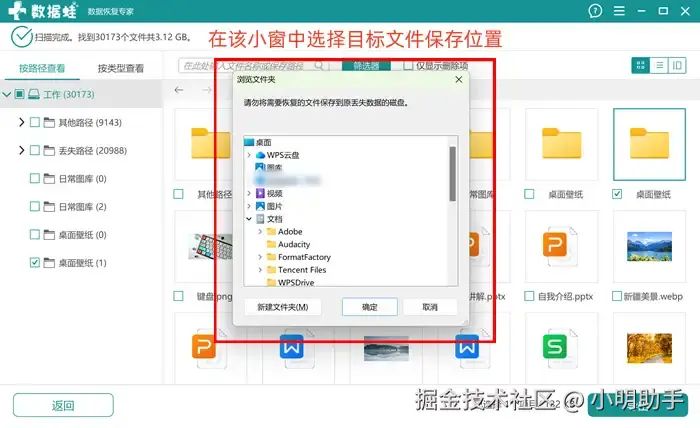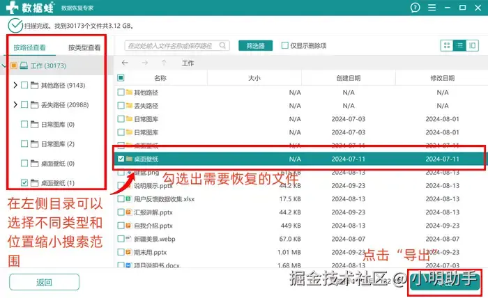 温馨提示:如果在一堆文件中找不到自己需要恢复的文件,可以选择在左侧的目录选择相应的文件位置或小分类,减小搜索范围。