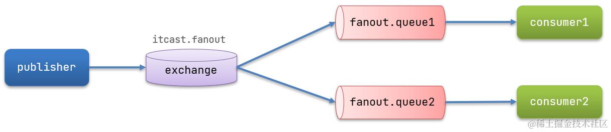 - Fanout:广播,将消息交给所有绑定到交换机的队列
