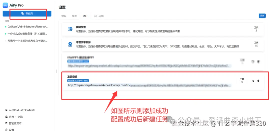 去云市场找到一个成熟查验发票的MCP,然后配置到AiPy上。获取SSE** 的配置链接的方法如下: