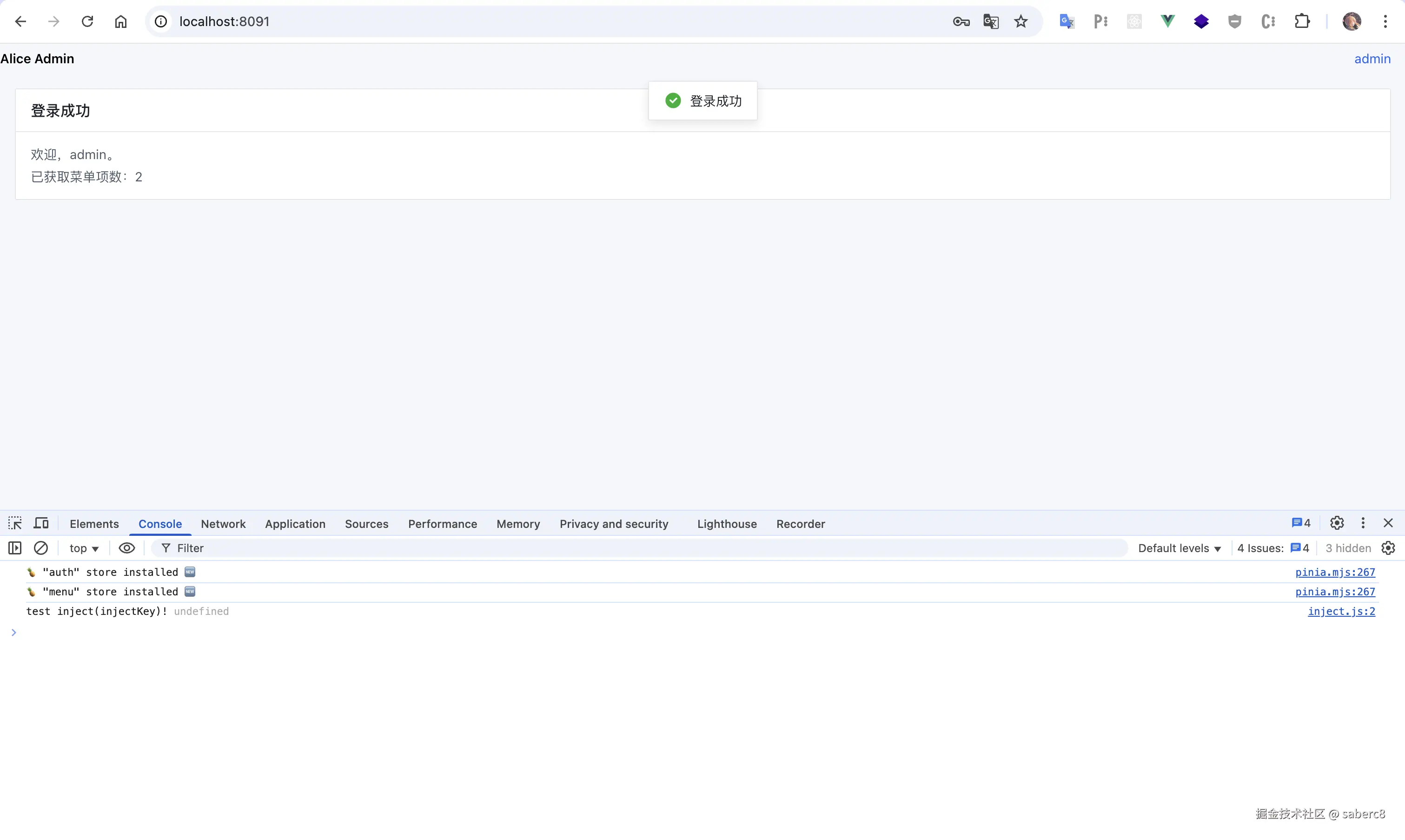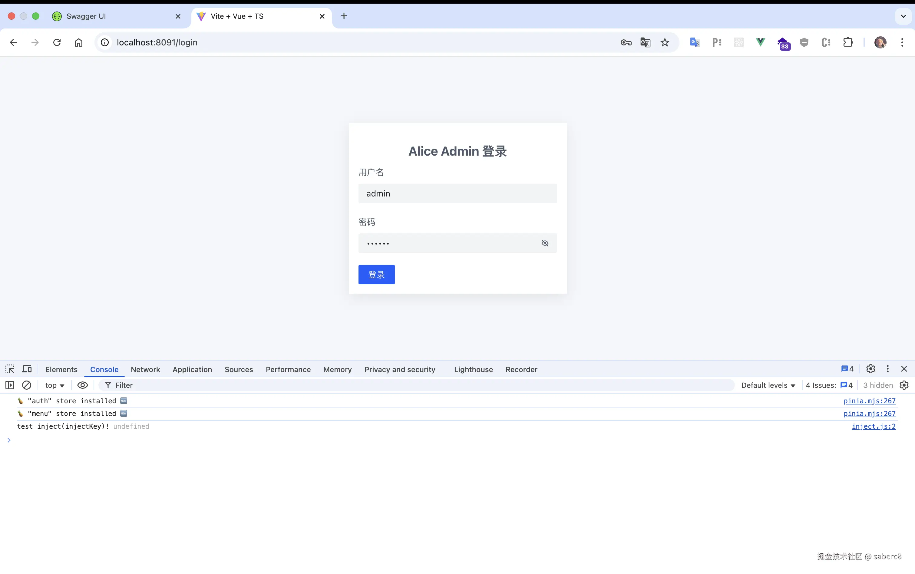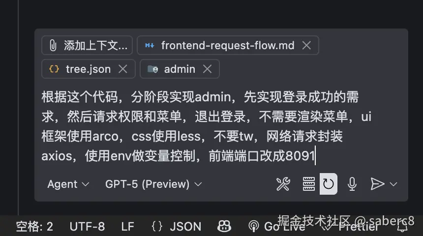 根据这个代码,分阶段实现admin,先实现登录成功的需求,然后请求权限和菜单,退出登录,不需要渲染菜单,ui框架使用arco,css使用less,不要tw,网络请求封装axios,使用env做变量控制,前端端口改成8091