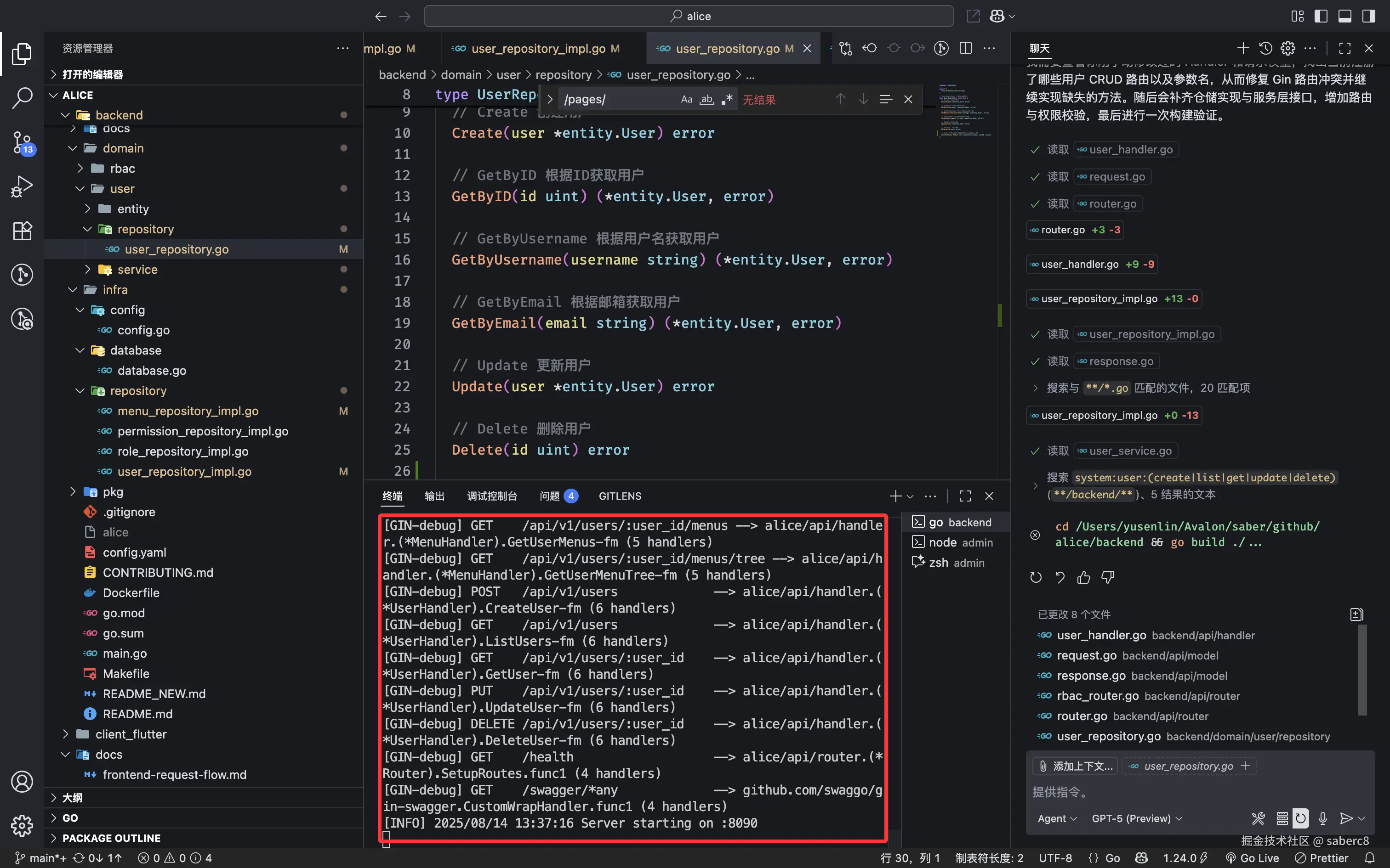 [GIN-debug] GET /api/v1/users --> alice/api/handler.(*UserHandler).ListUsers-fm (6 handlers)