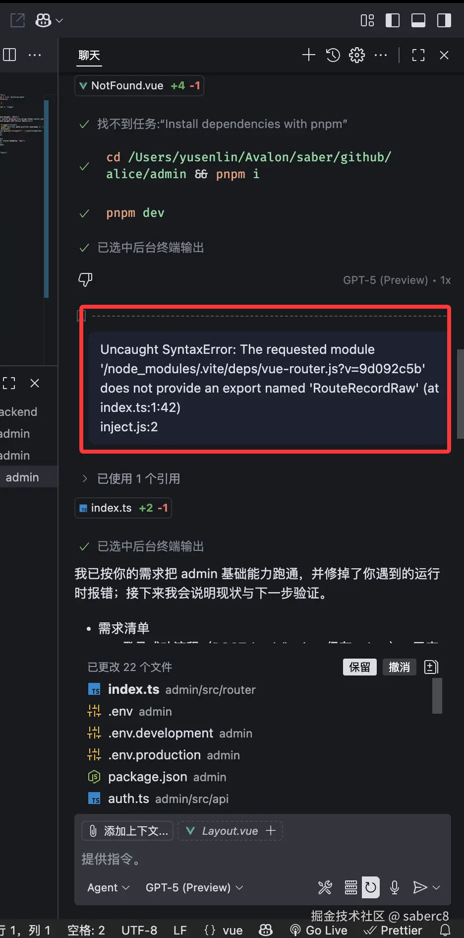 Uncaught SyntaxError: The requested module '/node_modules/.vite/deps/vue-router.js?v=9d092c5b' does not provide an export named 'RouteRecordRaw' (at index.ts:1:42) inject.js:2