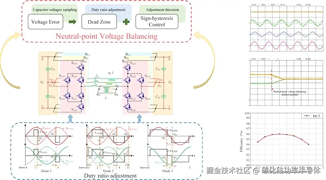混合拓扑的挑战在于其控制的复杂性。由于SiC和Si器件的开关特性差异巨大,需要专门的调制策略和门极时序控制(如交错式栅极信号脉冲,staggered gate signal pulses),以确保SiC在高频下快速切换,而IGBT则在低频或准零电压开关(ZVS)条件下工作 。这种协同控制对于实现中点电位平衡和热管理至关重要,因为任何不恰当的控制都可能导致损耗分布不均,进而加剧不平衡。
