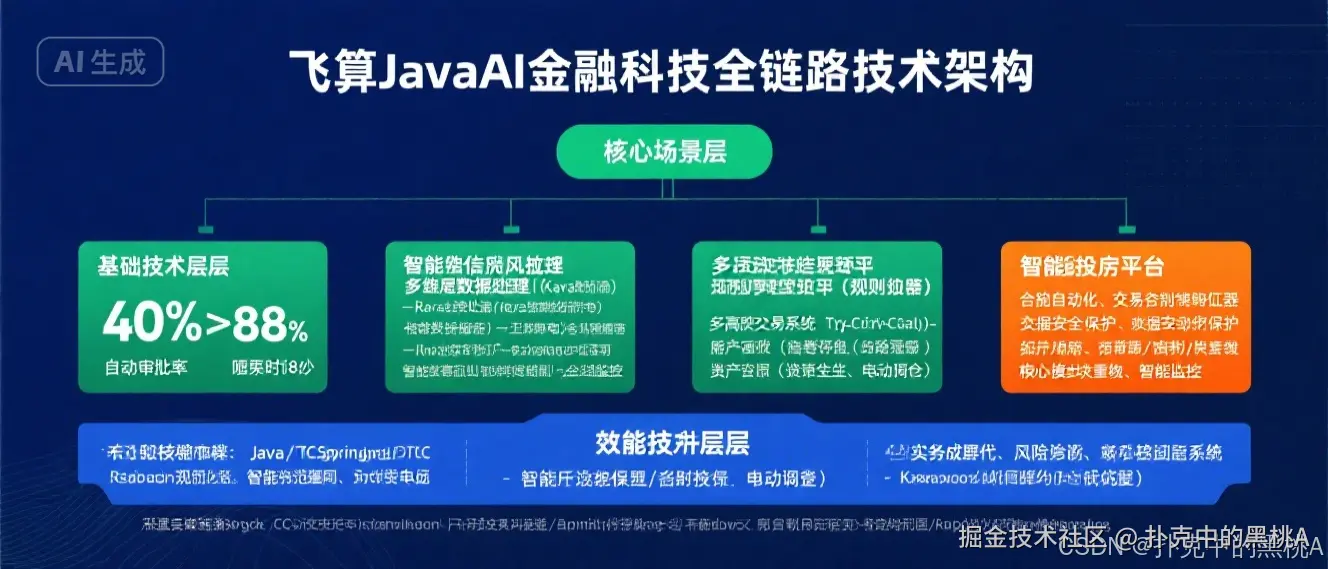 在金融科技领域,"风险防控" 与 "用户体验" 的矛盾、"合规要求" 与 "业务创新" 的平衡始终是技术团队的核心挑战。传统开发模式下,一套覆盖信贷风控、智能投顾、支付结算的综合金融系统需投入 20 人团队开发 10 个月以上,且频繁面临 "风控滞后"" 交易峰值处理能力不足 ""合规审计困难" 等问题。飞算 JavaAI 通过金融场景深度适配,构建了从风险识别到智能决策的全栈解决方案,将核心系统开发周期缩短 70% 的同时,保障了金融级系统 99.999% 的运行可用性。本文聚焦金融科技领域的技术实践,解析飞算 JavaAI 如何重塑金融系统开发范式。