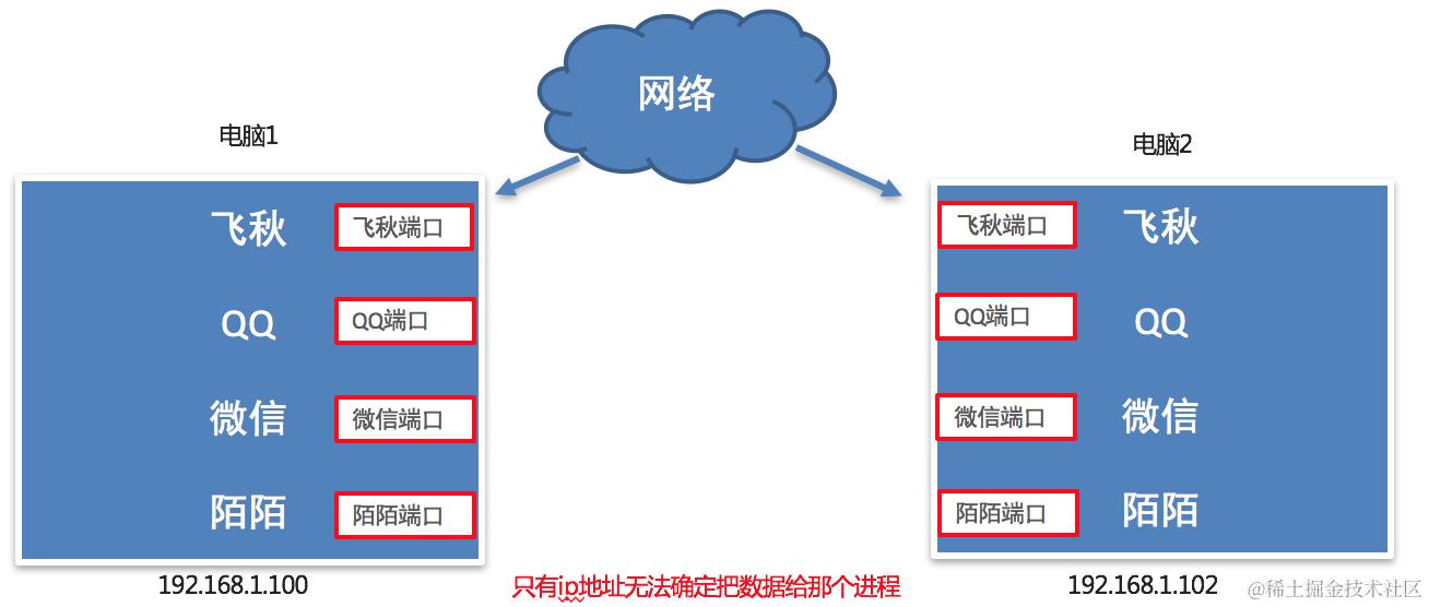 其实,每运行一个网络程序都会有一个端口,想要给对应的程序发送数据,找到对应的端口即可。