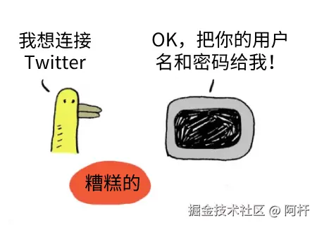 用户照做了,但他们实际上并没有登录 Twitter,而是将数据发送给了你——这个替他们登录 Twitter 的第三方服务。