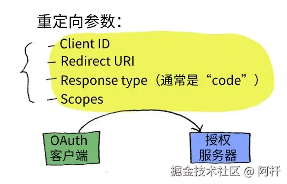 它把用户重定向到授权服务器,用户登录、同意授权范围,然后带着授权码重定向回 OAuth 客户端。