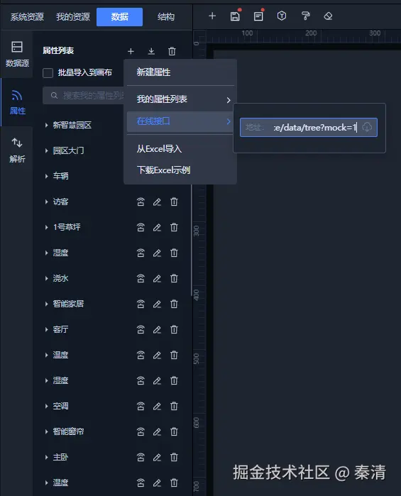 导入属性选择“在线接口”,在地址栏输入接口地址(这里使用了官方示例接口:/api/device/data/tree?mock=1),点击图标/回车,可以看到数据都被请求并且显示到当前属性列表了。