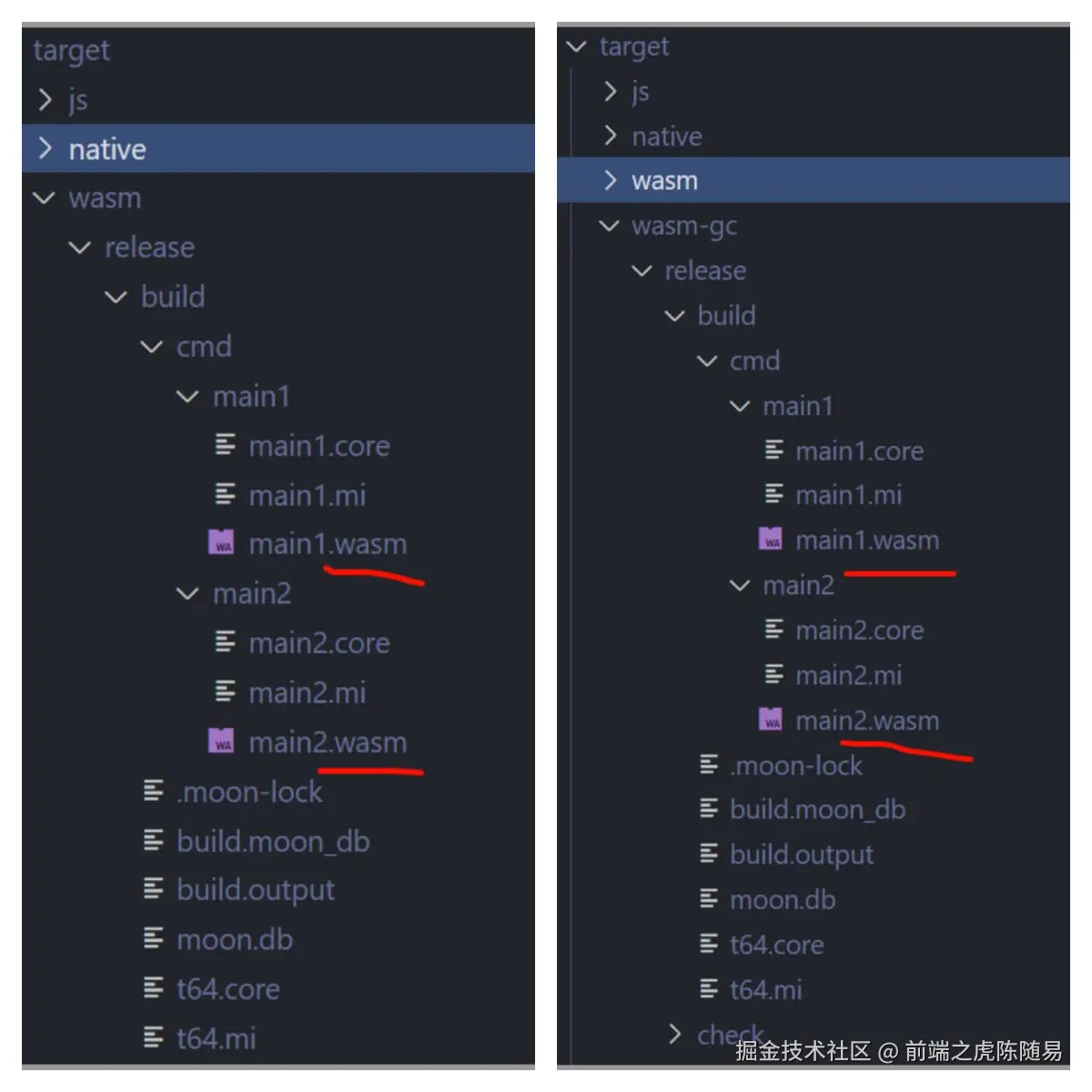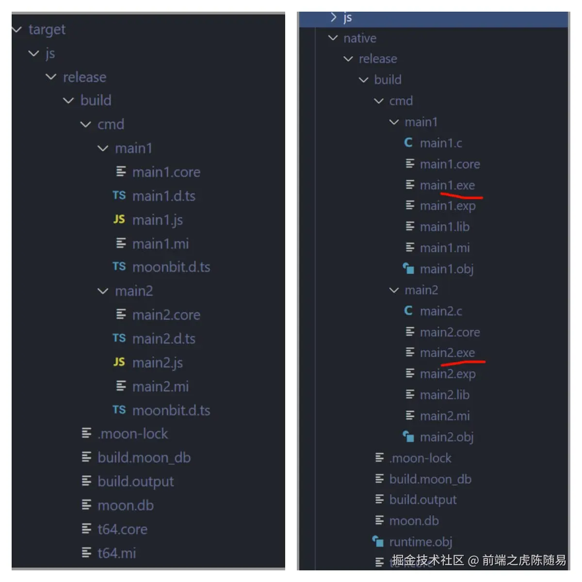所以当我们执行 moon build --target all 命令的时候,就会生成上图中的 js、native(exe),wasm 和 wasm-gc 4 种编译结果 (llvm目前还不稳定,只在nightly版本下生成),每个编译结果都有 main1 和 main2 两个文件,与我们上面的配置一致。