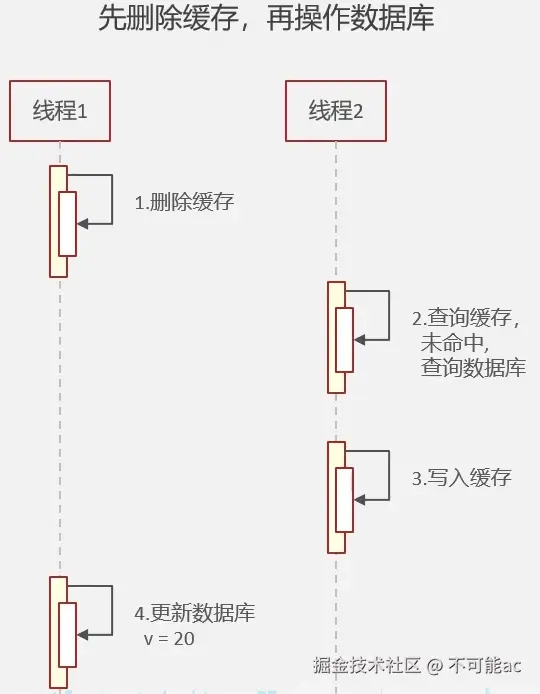 - 先删除缓存,在操作数据库: 高并发情况下,线程1删除了缓存 ,线程2开始查询缓存未命中查询数据库又写入到缓存中,而线程1后更新了数据库导致数据不一致