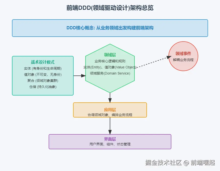 下面这张图展示了前端DDD架构的核心概念和层次结构: