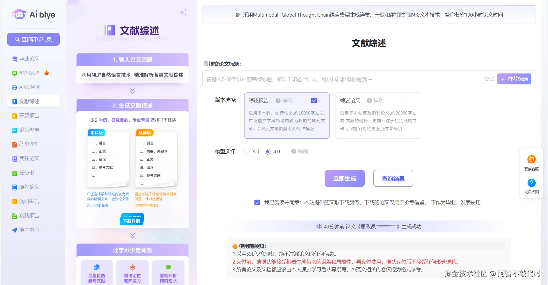 aibiye中选择“文献综述”功能,进入专用界面。 - 输入研究主题或上传参考文献文件(支持批量上传,最多50篇)。