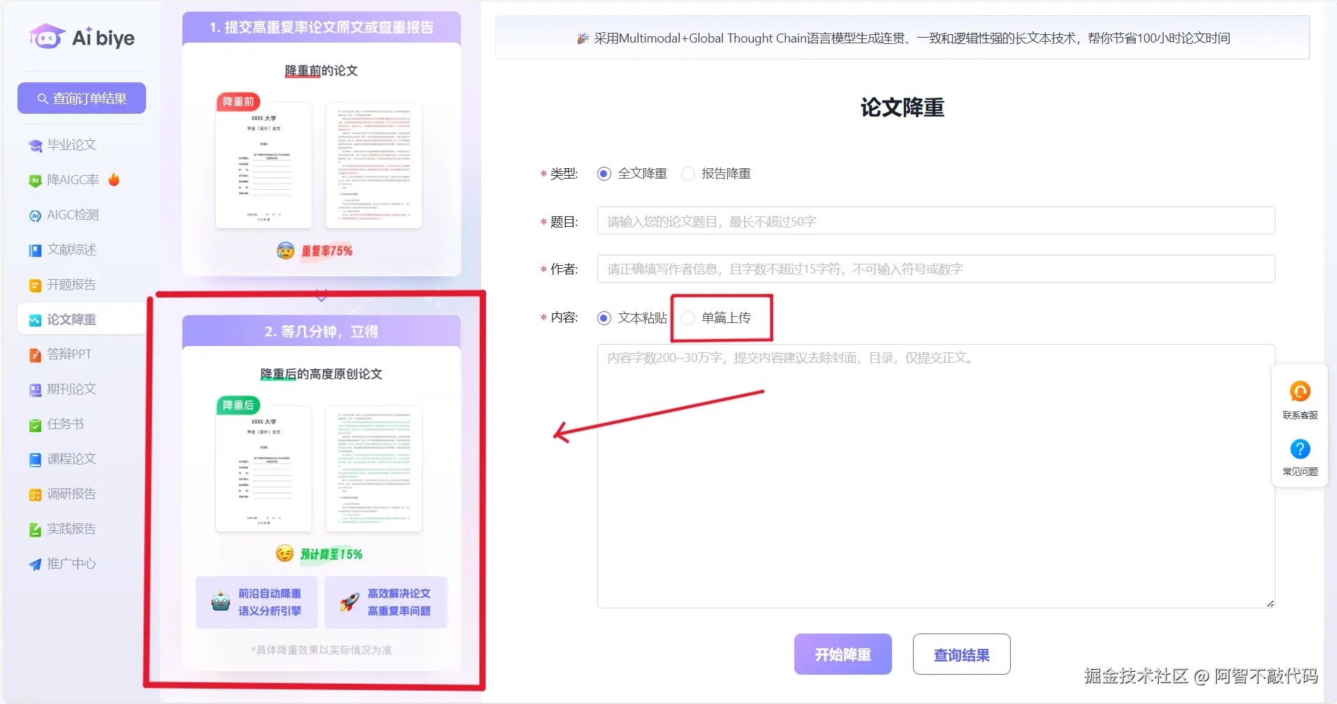 DOCX或PDF,最大支持100MB文件)。 - 选择“降重”功能,设置参数(如目标重复率,系统默认推荐10%以下)。