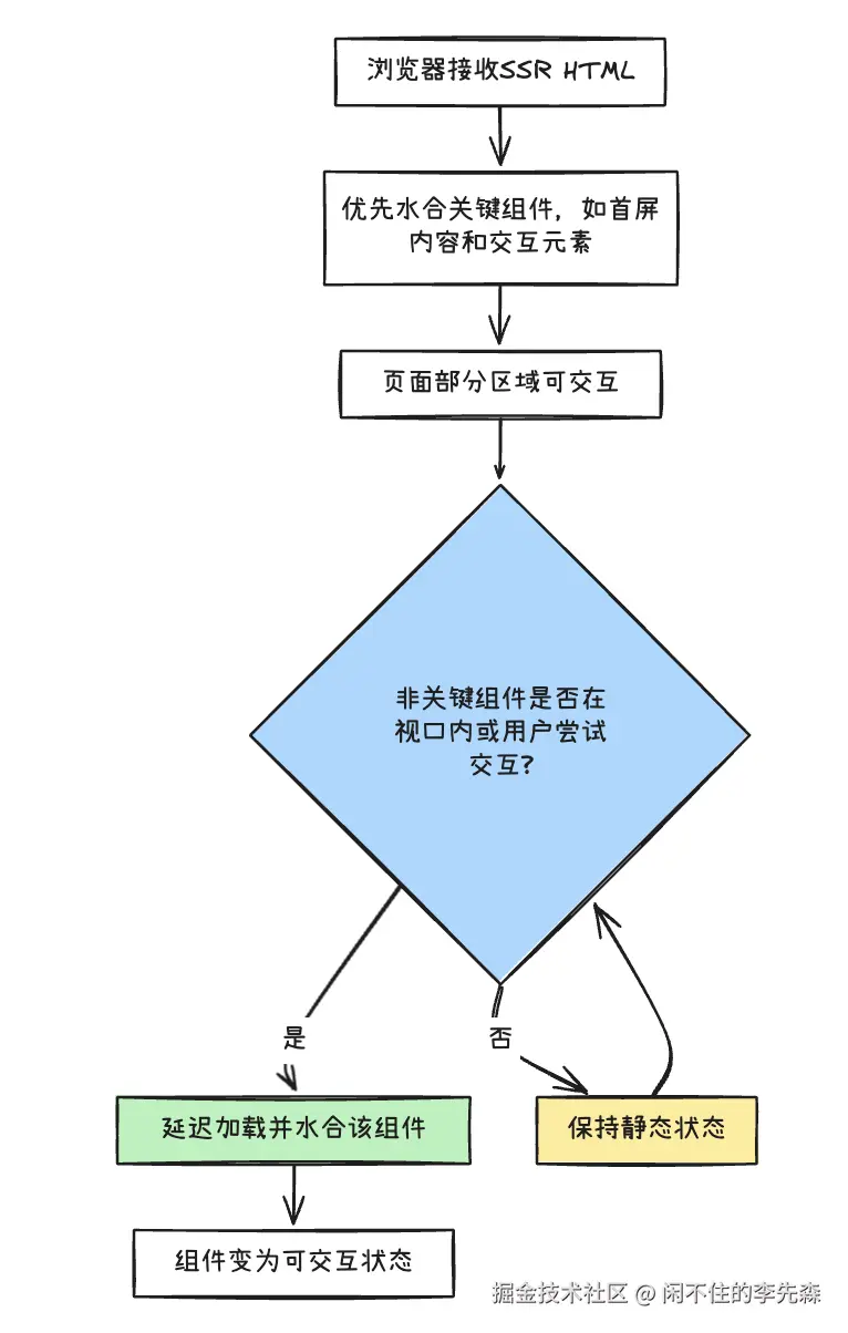 渐进式水合是对传统"水合"过程的优化,它允许按需、分阶段地对组件进行水合(绑定事件等),而不是一次性水合整个应用程序。