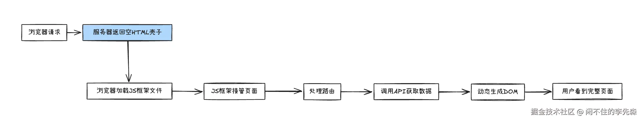随着AJAX技术的出现和前端框架的成熟,客户端渲染逐渐成为主流。CSR模式下,服务器只提供静态HTML壳子和JavaScript文件,真正的页面渲染工作在浏览器中完成。