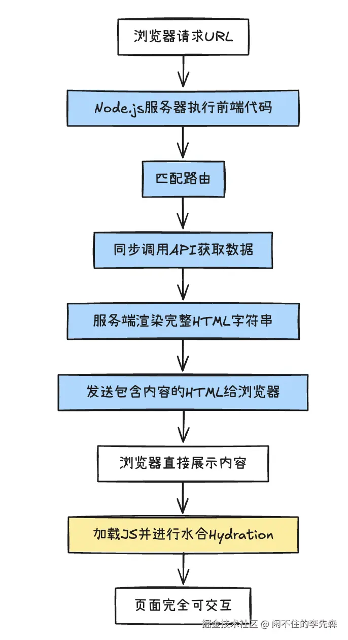 混合式渲染基于传统 SSR 渲染的方式进行了更加极致的性能优化, 关键技术是选择水合 Hydration。