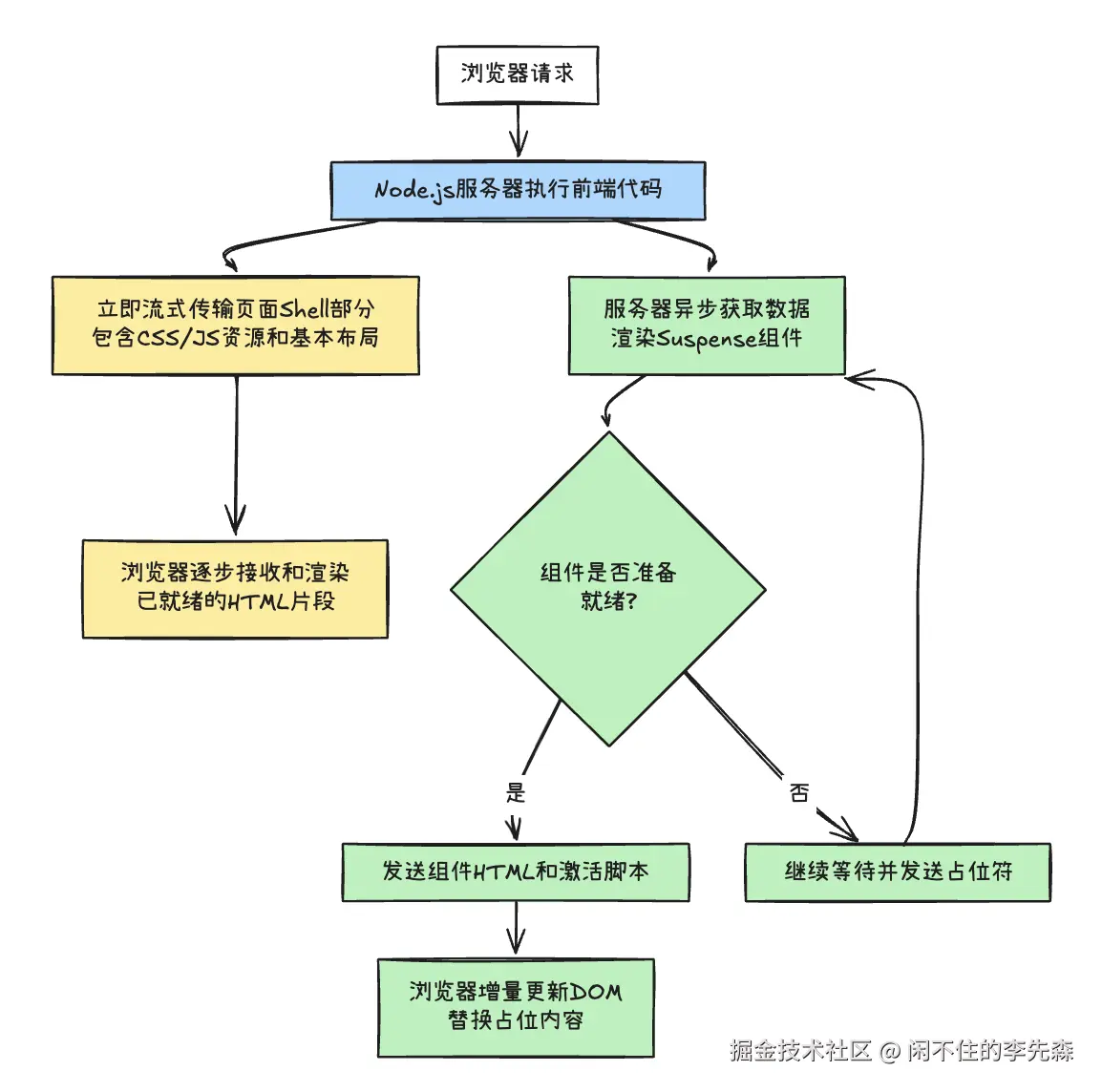 流式 SSR 与 React Suspense 紧密集成。当组件使用 Suspense 包装时,服务器会先发送 fallback 内容,然后在数据准备好时发送实际内容。