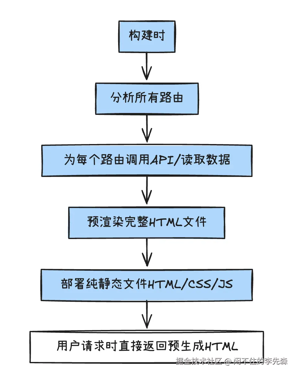 对于内容相对固定的网站,静态站点生成提供了更优解决方案。SSG在构建时预渲染所有页面为静态HTML文件,无需服务器实时渲染。