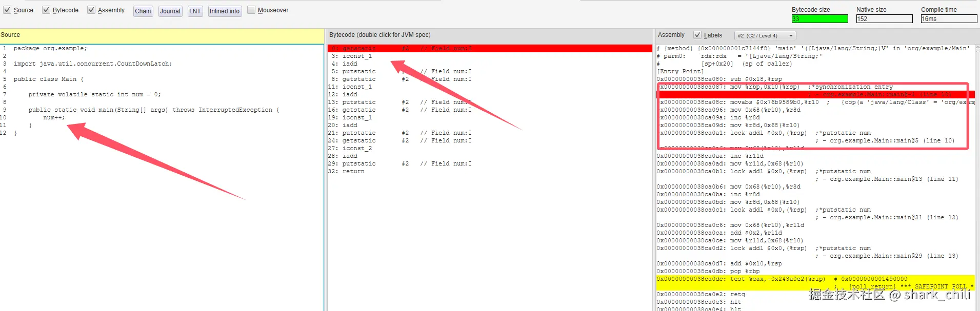 对应的观测截图如下,可以看到我们可以基于代码段做到字节码和汇编码的对照: