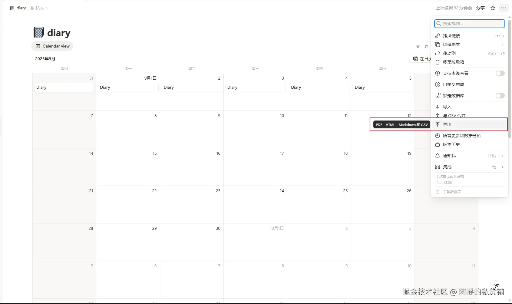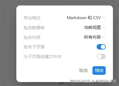 3.2 首次使用Notion会有20次免费使用AI的机会,如果超过了20次,需要购买会员才能使用,那怎么办呢? 粉丝福利了! 我们也可以将内容导出然后直接给到大模型帮我们处理。这里可以导出多种文件格式,我一般会使用Markdown和csv,这样AI比较好识别,另外自己也方便查看和编辑。记住需要点击包含子页面,才能把日记内容一起涵盖进去。