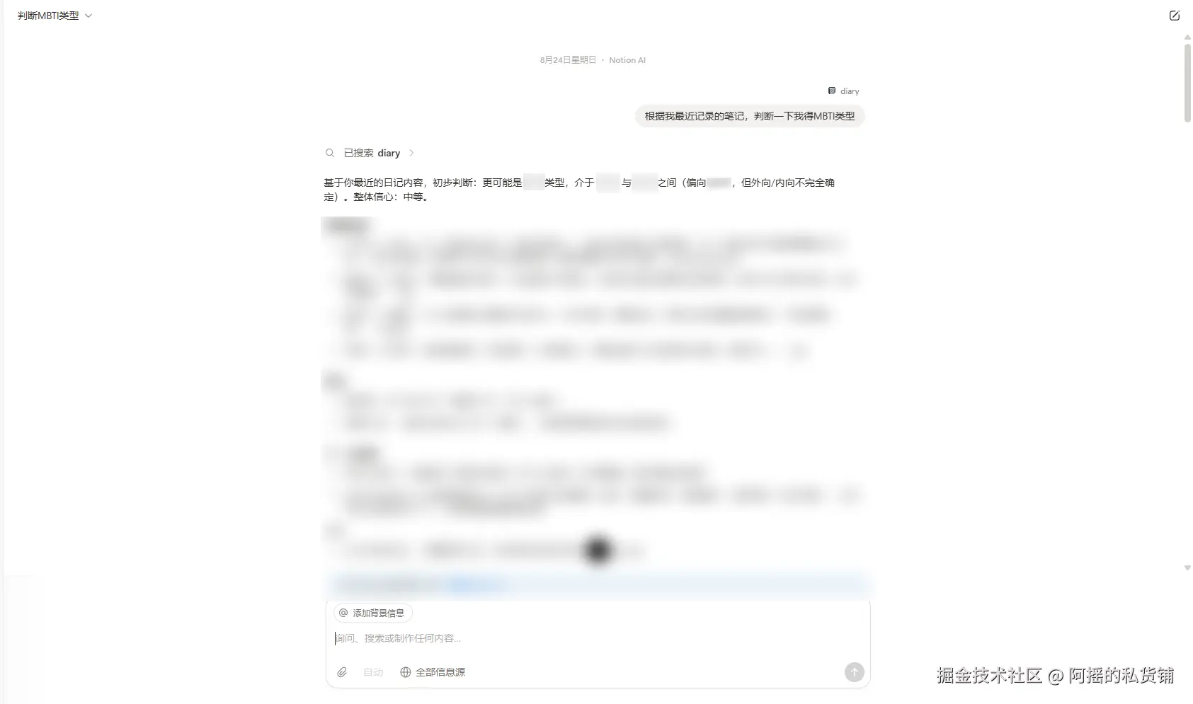 最近在思考一个问题,有句话叫软件吞噬世界,AI吞噬软件。在当前AI可以生成代码,且效果能达到中级程序员的水准&水平还在不断提高的情况下,那么每个人还有什么是可以守护的呢? 我认为如果未来还是以人为本,个人数据是很重要的一个方面,每个人的个人数据可以用来制作自己的仿生人,数字人以及其他的数字生命。于是我近期开始去写日记,记录自己的日常,所思所想以及最终的决策,并找了市面上一个还不错的工具Notion来做这个事,下面就是一些初步的使用。 www.notion.com/