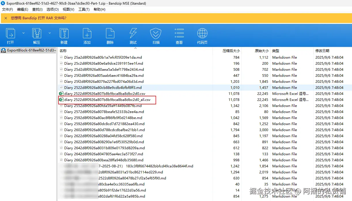 3.3 导出后一般会生成一个zip压缩包,我们整理的日记内容主要是在这个xx_all.csv中,可以直接将其给到AI,让AI帮我们进行分析。