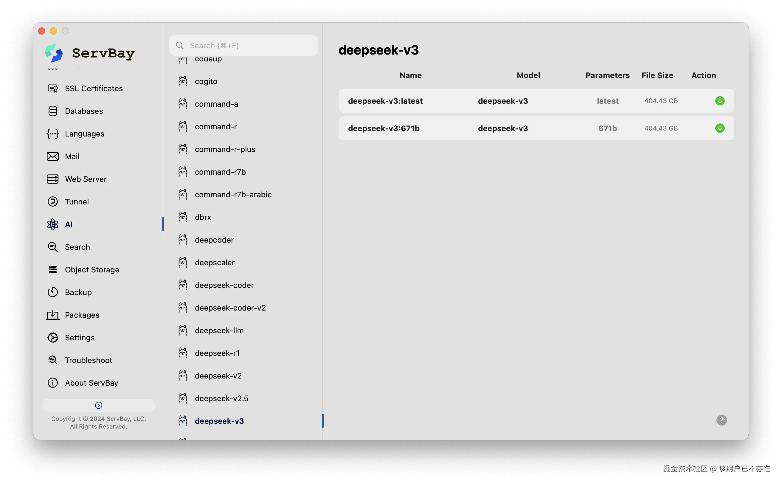 - 本地 AI 集成: ServBay 集成了DeepSeek等强大的大语言模型,并让它们在你的本地机器上离线运行。开发者可以在本地上随便处理包含敏感业务逻辑的Node.js代码。