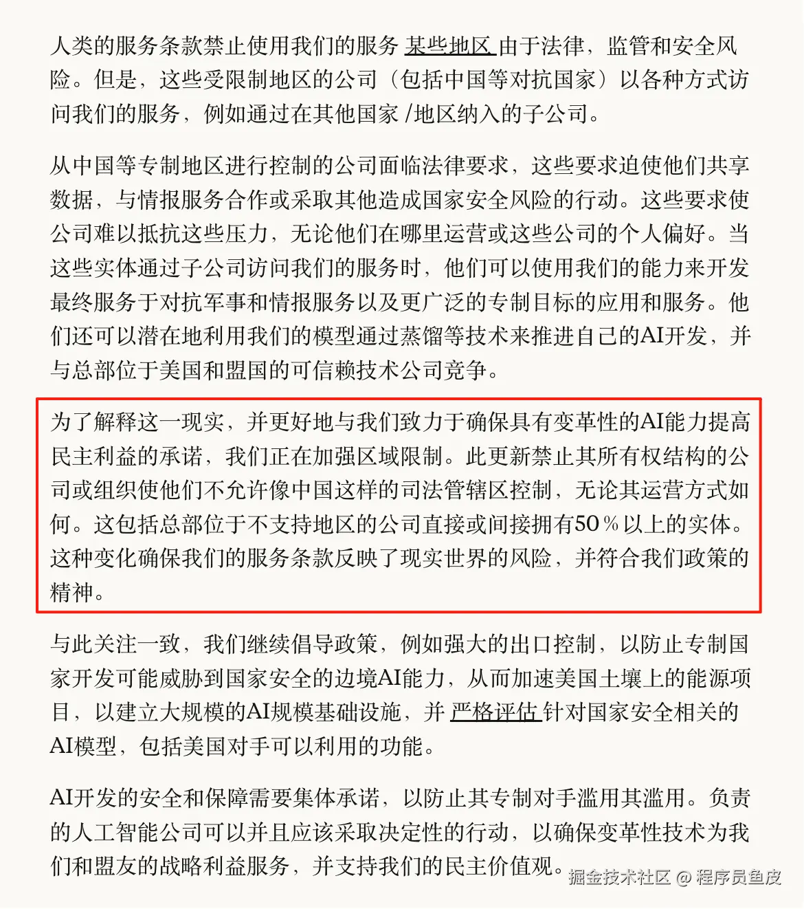 更狠的来了:当这些实体通过子公司访问我们的服务时,他们可能会使用我们的能力来开发应用和服务,最终为敌对的军事和情报部门以及更广泛的威权目标服务。他们还可能使用我们的模型通过蒸馏等技术推进自己的 AI 开发,并在全球范围内与总部位于美国和盟国的可信技术公司竞争。